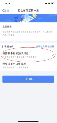 (三)选择填报方式,建议选择“我需要申报表预填服务”→“开始申报”,可快速进行申报。
