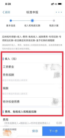 (六)查看“收入和税前扣除”信息,包括工资薪金、劳务报酬、稿酬和特许权使用费,点击最后的箭头可查看每种收入的明细。确认无误后点击“下一步”。