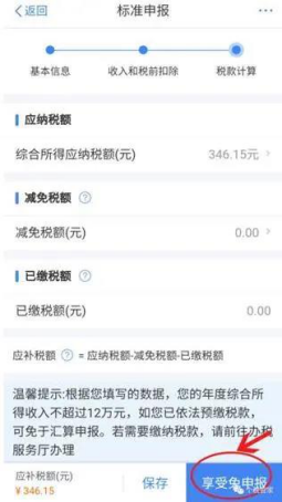 1.税款计算后,查看应补税款,点击“享受免申报”。