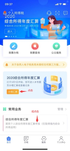 (一)打开并登陆“个人所得税”APP,点击“2020综合所得年度汇算”或“常用业务”下的“综合所得年度汇算”。