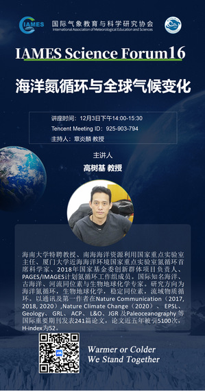 海南大学特聘教授、南海海洋资源利用国家重点实验室主任、厦门大学近海海洋环境国家重点实验室氮循环首席科学家、2018年国家基金委创新群体项目负责人、PAGES/IMAGES计划氮循环工作组成员。国际知名海洋、古海洋、河流同位素与生物地球化学专家。研究方向为海洋氮循环,生物地球化学,稳定同位素,流域物质循环。以通讯及第一作者在Nature Communication(2017, 2018, 2020),Nature Climate Change(2020)、 EPSL、 Geology、 GRL、 ACP、 L&O、JGR 及Paleoceanography 等国际重要期刊发表241篇论文,论文近五年被引5100次,H-index为52。