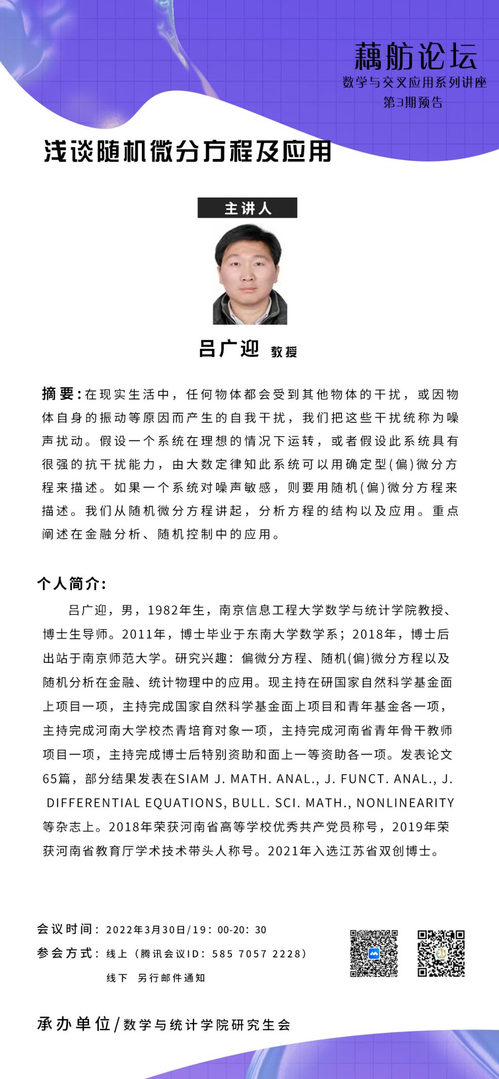 吕广迎,男,1982年生,南京信息工程大学数学与统计学院,教授,博士生导师。2011年,博士毕业于东南大学数学系;2018年,博士后出站于南京师范大学。研究兴趣:偏微分方程、随机(偏)微分方程以及随机分析在金融、统计物理中的应用。现主持在研国家自然科学基金面上项目一项,主持完成国家自然科学基金面上项目和青年基金各一项,主持完成河南大学校杰青培育对象一项,主持完成河南省青年骨干教师项目一项,主持完成博士后特别资助和面上一等资助各一项。发表论文65篇,部分结果发表在SIAM J. Math. Anal., J. Funct. Anal., J. Differential Equations, Bull. Sci. Math., Nonlinearity等杂志上。2018年荣获河南省高等学校优秀共产党员称号,2019年荣获河南省教育厅学术技术带头人称号。2021年入选江苏省双创博士。