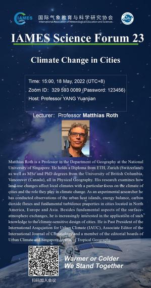 Matthias Roth is a Professor in the Department of Geography at the National University of Singapore. He holds a Diploma from ETH, Zurich (Switzerland) as well as MSc and PhD degrees from the University of British Columbia, Vancouver (Canada), all in Physical Geography. His research examines how land-use changes affect local climates with a particular focus on the climate of cities and the role they play in climate change. As an experimental researcher he has conducted observations of the urban heat islands, energy balance, carbon dioxide fluxes and fundamental turbulence properties in cities located in North America, Europe and Asia. Besides fundamental aspects of the surface-atmosphere exchanges, he is increasingly interested in the application of such knowledge to the climate-sensitive design of cities. He is Past President of the International Association for Urban Climate (IAUC), Associate Editor of the International Journal of Climatology and a member of the editorial boards of Urban Climate and Singapore Journal of Tropical Geography.