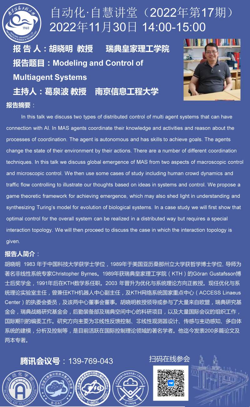 自动化·自慧讲堂(2022年第17期)特邀瑞典皇家理工学院胡晓明教授作学术报告